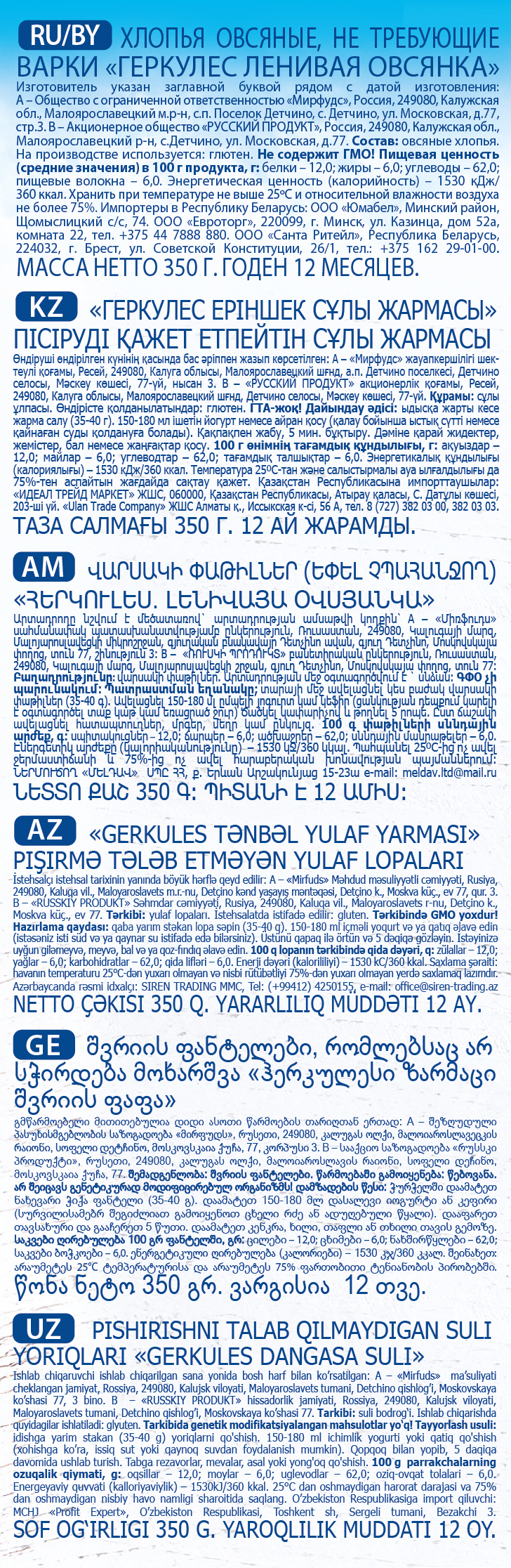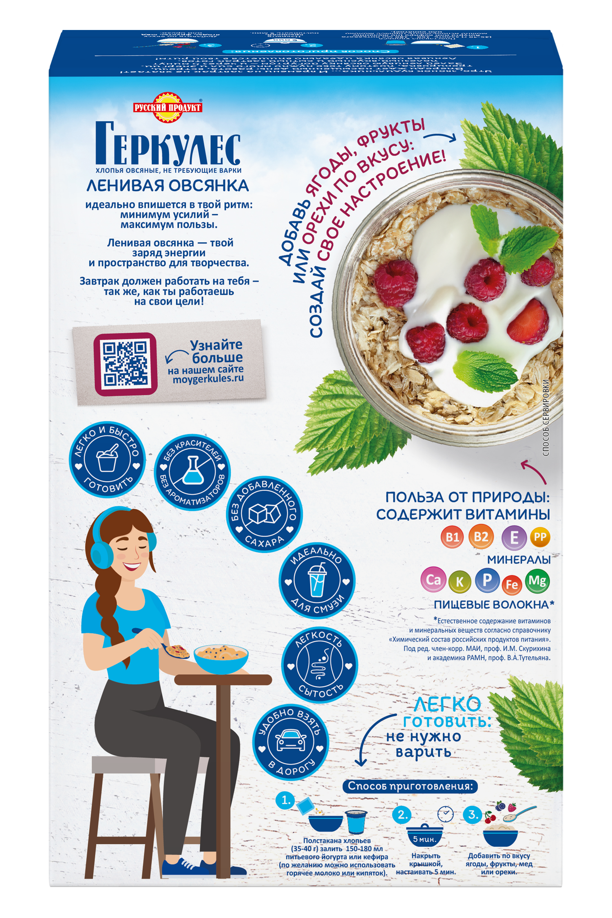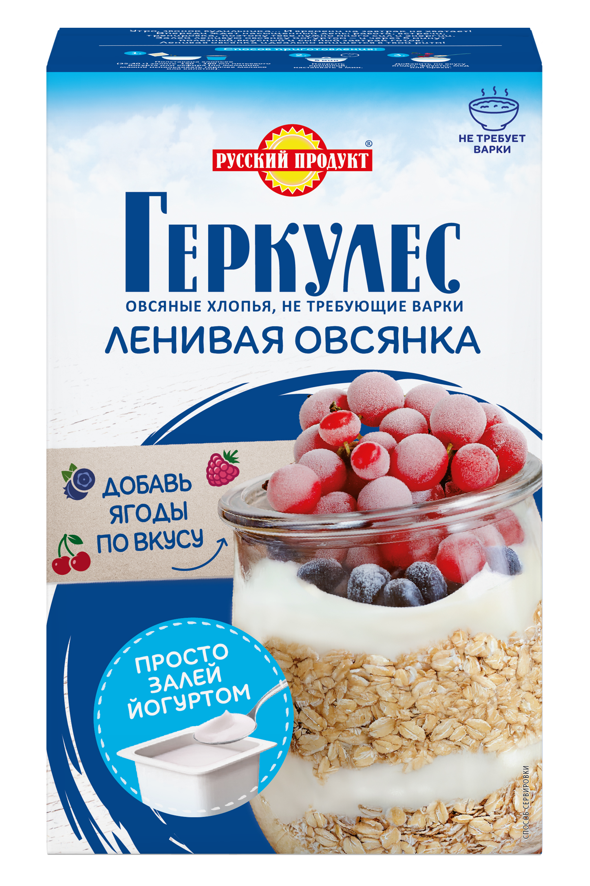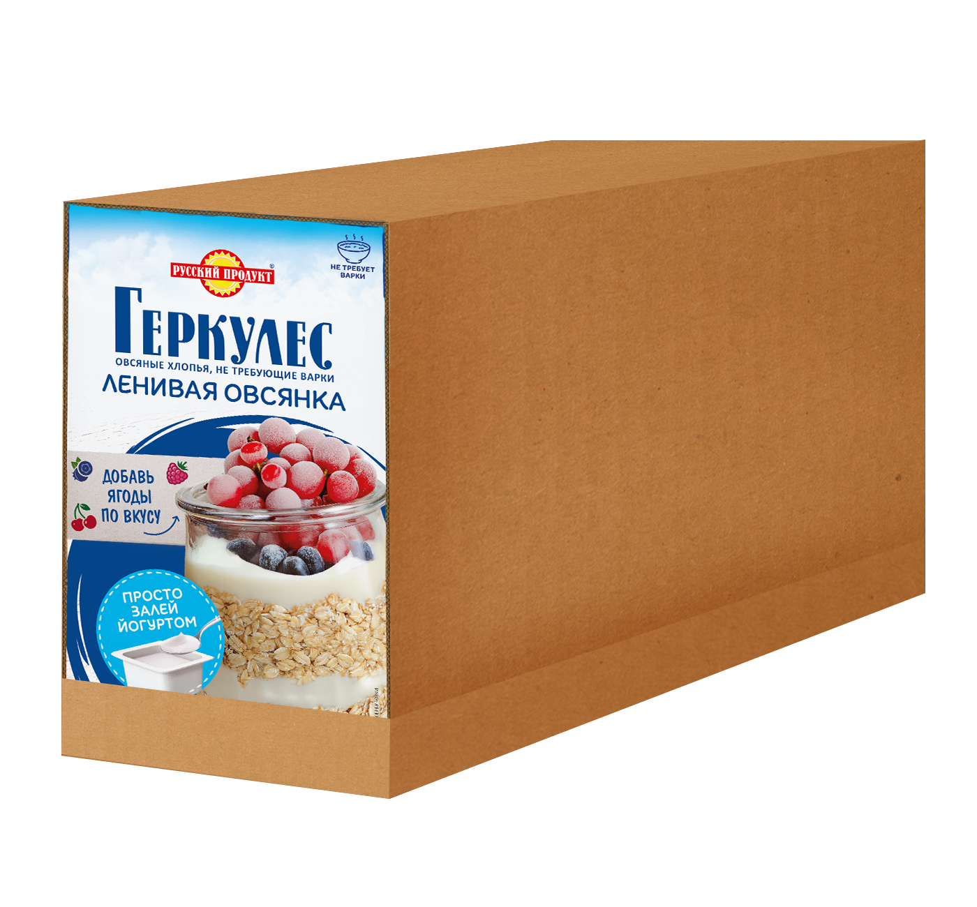 | Геркулес | Бакалея | Геркулес | Геркулес не требующий варки "Ленивая овсянка" 350 гр. /1*6 ш... | 2700420 | Коробка |  4680176172020 | 350 | 0,00139 | 120 | 61 | 190 | 21.04.2025 |  | 10 | Утро, звонок будильника: И времени на завтрак не хватает! Вп... | 1. Полстакана хлопьев (35-40) г. залить 150-180 мл питьевого... | Овсяные хлопья.